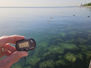 It has a sensor tethered by a long enough (64cm/25″) wire to reach a water surface you’d like to measure beyond arm’s length (i.e., below a seawall like the ones where we swim regularly, below the crest of waves, or if you’re otherwise not ready for closer approach to the water),